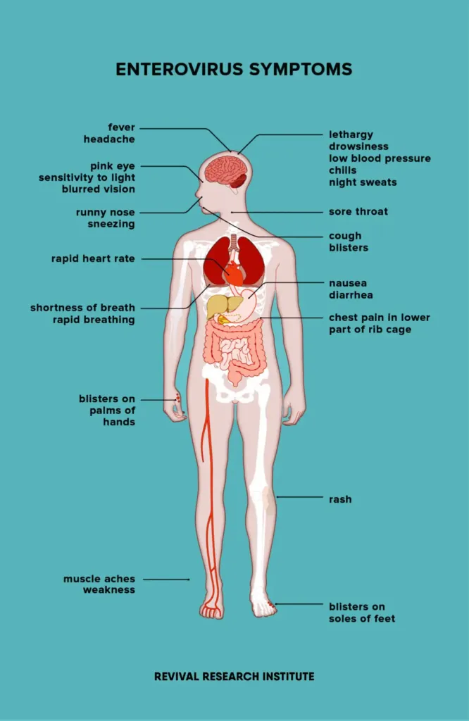 Enteroviruses are a group of viruses that typically live in the human gastrointestinal tract. These viruses can cause various symptoms, ranging from minor respiratory or gastrointestinal issues to more serious problems like meningitis or myocarditis. Enteroviruses are more common in youngsters, with outbreaks occurring more commonly throughout the summer and fall.