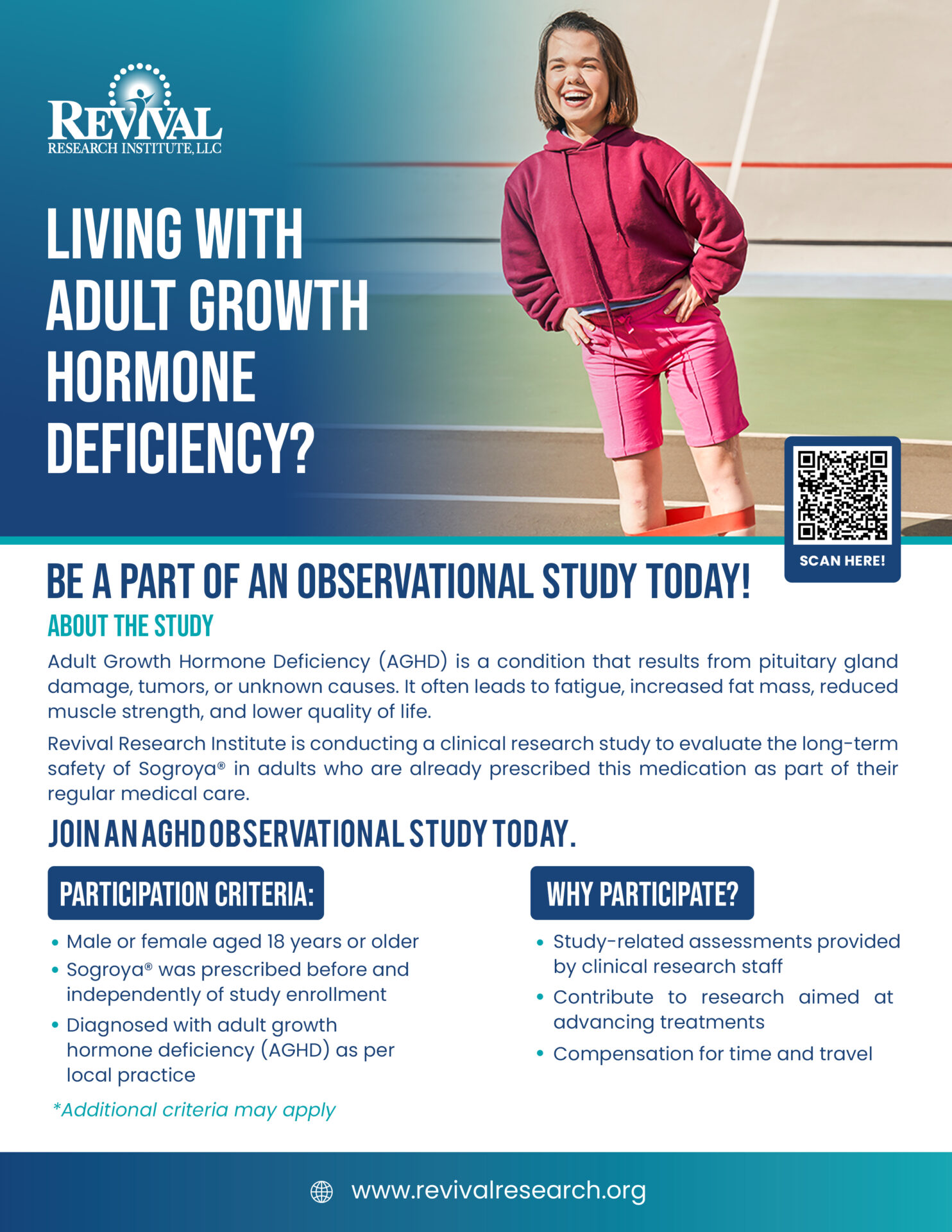 Revival Research Institute is committed to supporting clinical research that helps expand understanding of real-world health conditions. Our observational study for Adult Growth Hormone Deficiency (AGHD) is designed to gather long-term safety information from adults who are already prescribed Sogroya® as part of their regular medical care.