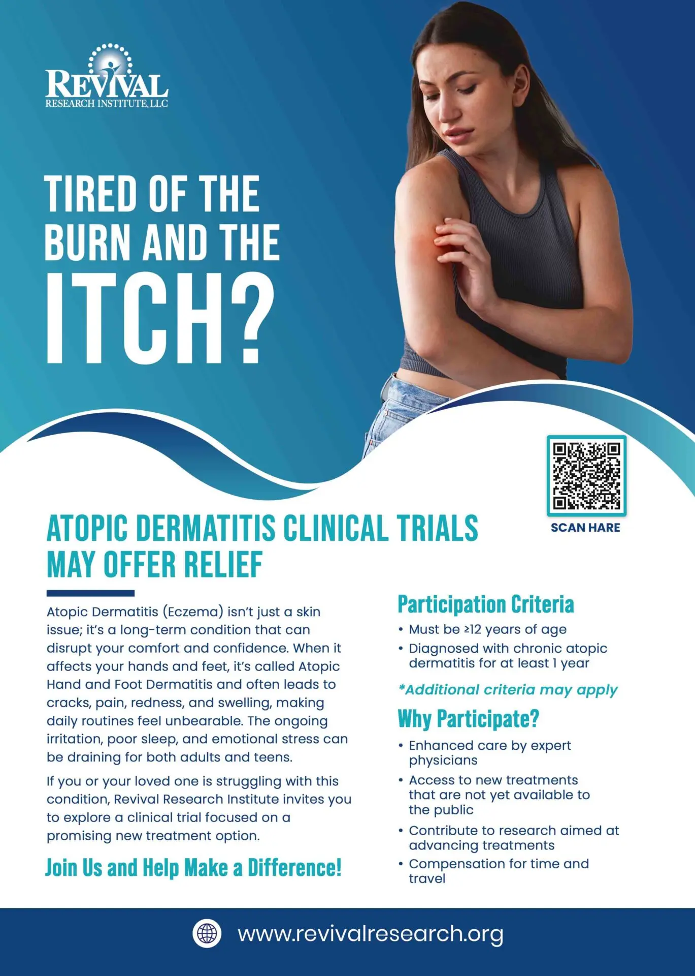 Seeking Relief from Itchy, Inflamed Skin? Revival Research Institute is conducting clinical trials in Michigan and Georgia to explore potential new treatments for moderate to severe Atopic Dermatitis (eczema).