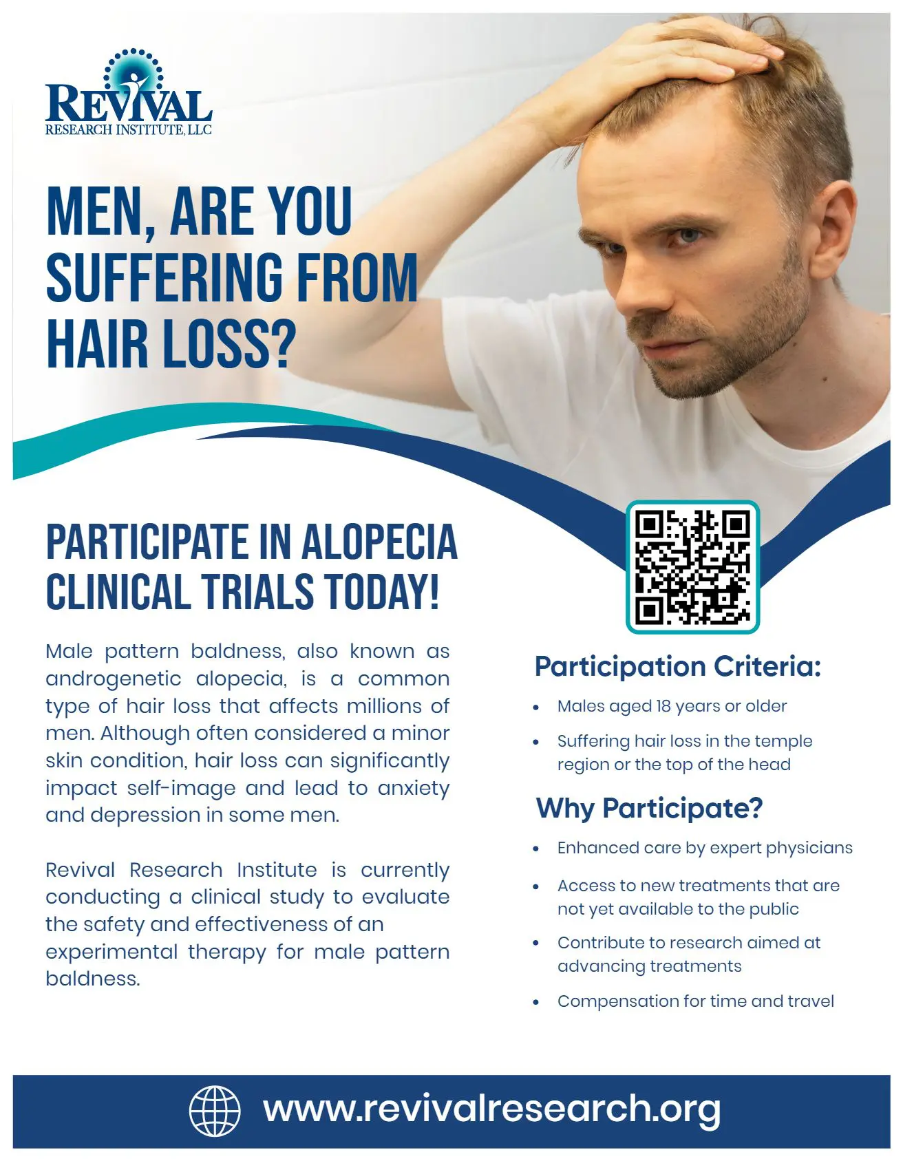 Struggling with hair thinning or patterned hair loss? Revival Research Institute is conducting clinical trials in Michigan to explore potential new treatments for androgenetic alopecia (male pattern baldness).
