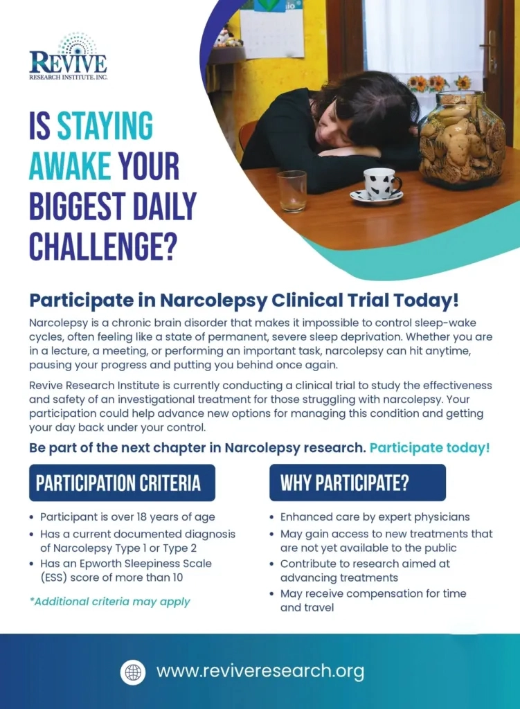 Revive Research Institute is conducting a clinical trial to help people living with a debilitating condition called Narcolepsy and cataplexy.