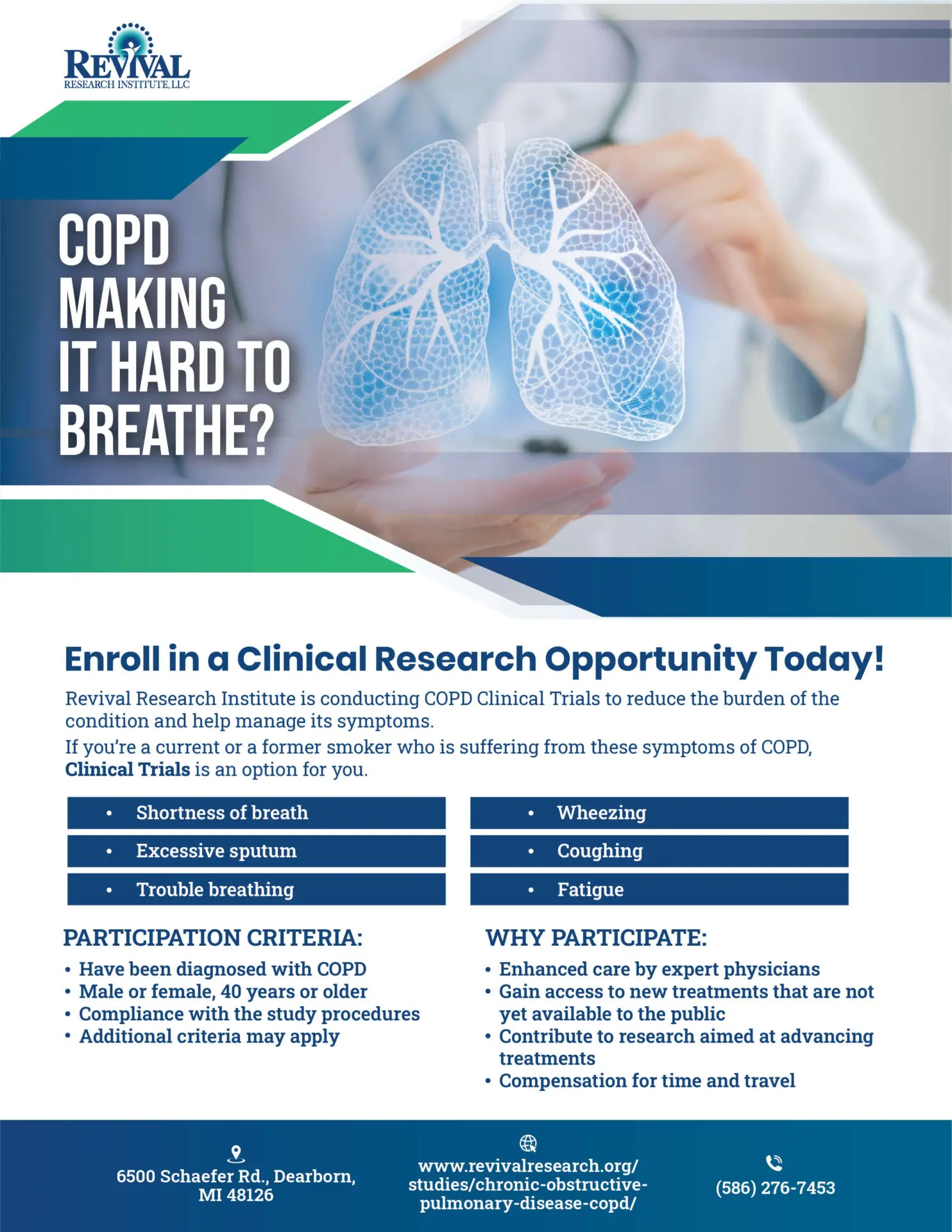 Struggling with shortness of breath or chronic cough? Revival Research Institute is conducting clinical trials in Michigan to explore potential new treatments for moderate to severe COPD.