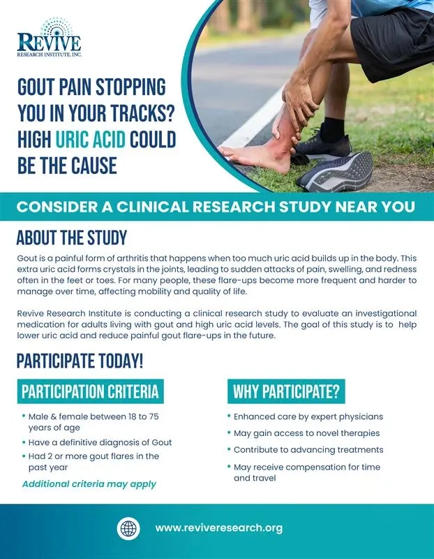 If you’re living with frequent gout flare-ups or struggling to manage high uric acid levels, consider joining the Hyperuricemia and Gout Clinical Trials in Michigan. These paid research studies, conducted by Revive Research Institute, aim to explore a potential new treatment option that could help reduce uric acid levels, manage gout symptoms, and improve overall quality of life.