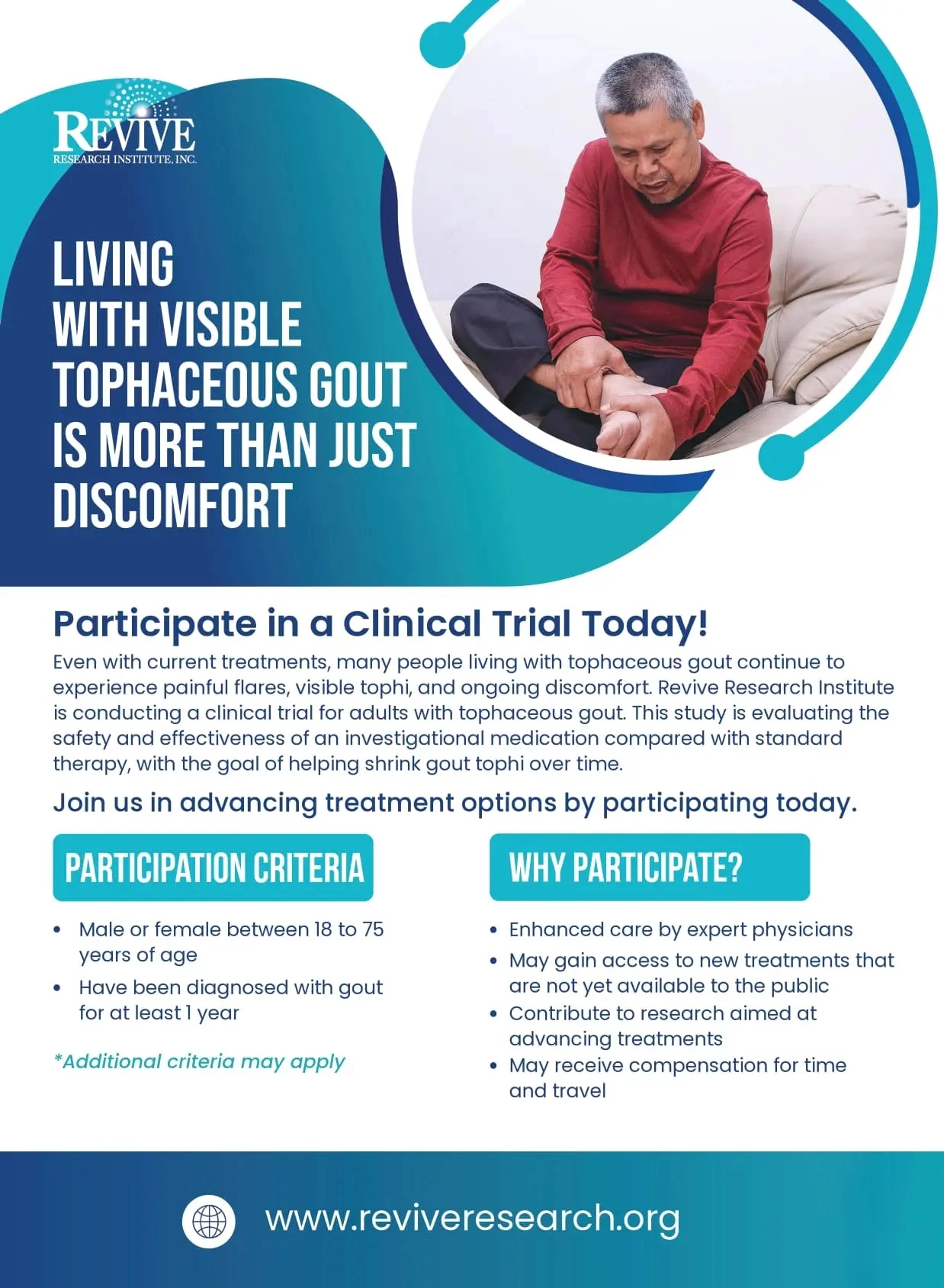 Revive Research Institute is dedicated to advancing rheumatology care through innovative clinical research. Our tophaceous gout clinical trials are designed with patient safety and scientific integrity in mind.