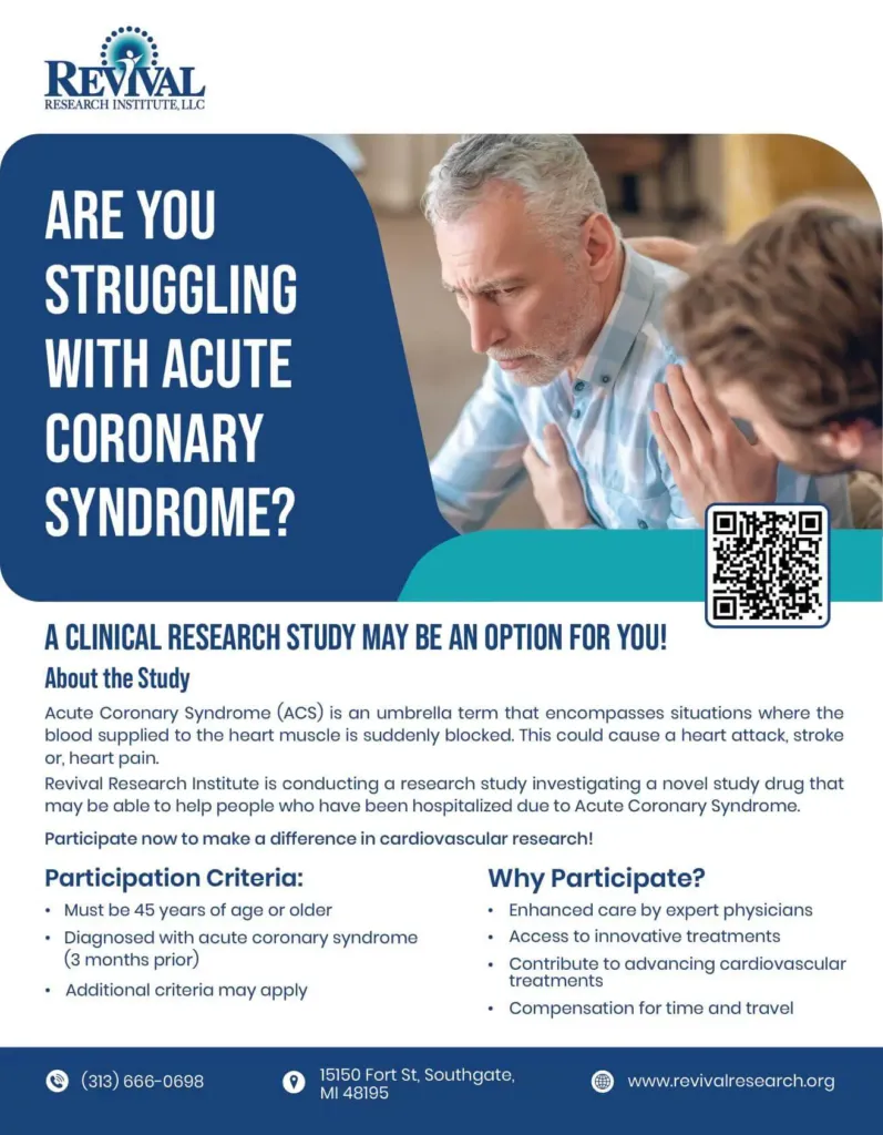 If you or someone you know has acute coronary syndrome, Revival Research Institute is conducting Acute Coronary Syndrome Clinical Trials, exploring potential new treatment options.