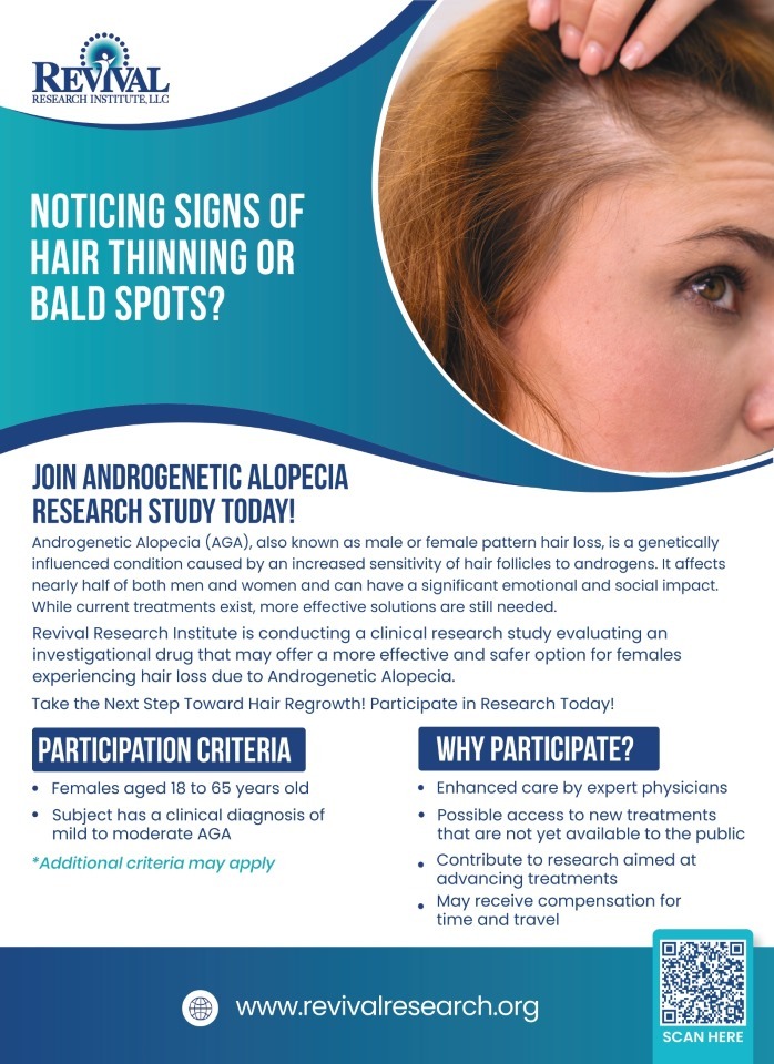 At Revival Research Institute, we are conducting Androgenetic Alopecia Clinical Trial to explore potential treatment options that may help slow hair loss and promote regrowth. Participating in this research study could contribute to advancing hair loss treatments and provide new hope for individuals experiencing AGA.