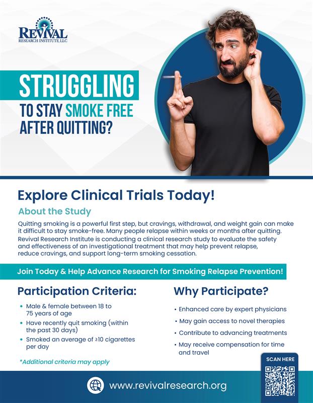Revival Research Institute is conducting clinical trials for smoking relapse to evaluate an investigational treatment that may potentially support smoking relapse prevention. These studies are designed to explore safe and effective approaches to staying smoke-free while contributing to the advancement of future treatment options.