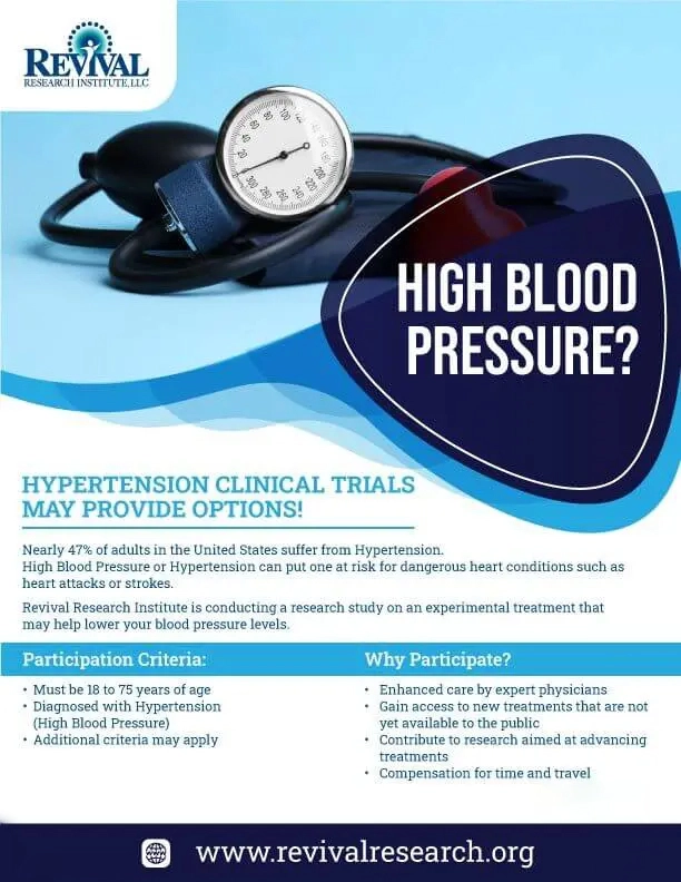 We at Revival Research Institute are conducting High Blood Pressure Clinical Trials on a study drug to help those diagnosed with hypertension manage their symptoms.